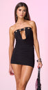 Mini DRESS, color negro, strapless, con remaches al frente, abertura al frente, tela de poliéster, Stretch, ideal para un Look moderno, y una ocasión especial.