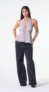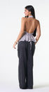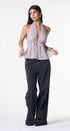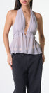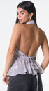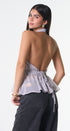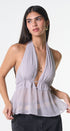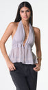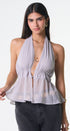 Top color gris, tela de poliéster, descote profundo al frente, elástico en la cintura, espalda, descubierta y amarre atrás en la espalda, ideal para un Look moderno y casual