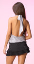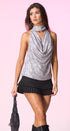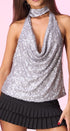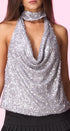 Top color, silver, con brillos, cuello de Hamaca, amarre en el cuello, espalda, totalmente abierta, corte a las caderas, ideal para un Look moderno, y una ocasión especial.
