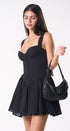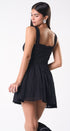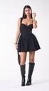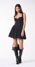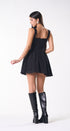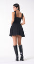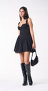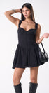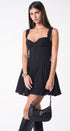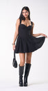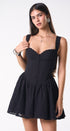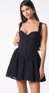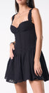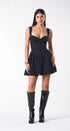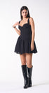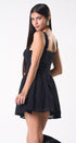 Vestido negro, de tela de encaje, parte de arriba tipo corset, con botones al frente, cierre de con zipper atrás, falda, volada, ideal para una ocasión especial