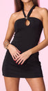 Mini DRESS, color negro, Halter, con detalles dorado, metálico al frente, ideal para un Look moderno y casual.