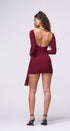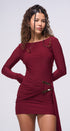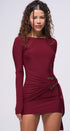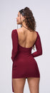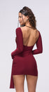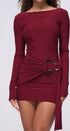 Vestido, color, Burgundy, manga larga, espalda, abierta, detalle de hebilla dorado al frente, ideal para un Look moderno y casual