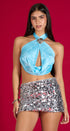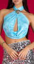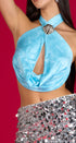 Top, color turquesa tiras cruzadas al frente Y amarre en el cuello, espalda, abierta, detalle metálicos, dorados, de estrella de mar, al frente, ideal para un Look moderno y casual
