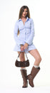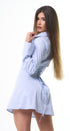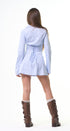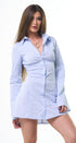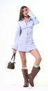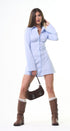 Vestido, estilo, camisero, celeste, con rayitas, con cuello botones al frente, manga, larga, ajuste por detrás con lace up para un ajuste perfecto, ideal para un Look moderno y casual.