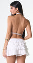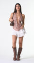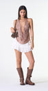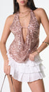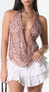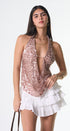Top de lentejuelas, color beige con café, espalda, abierta, corte, las caderas, ideal para una vocación especial