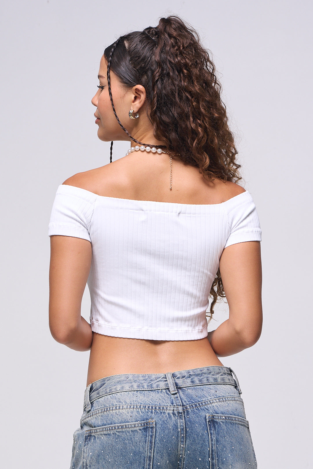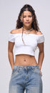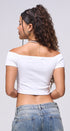 Top básico , Tela de knit , Stretch, color negro, Off Shoulders, corte la cintura, ideal para un Look moderno y casual y urbano