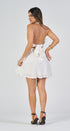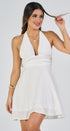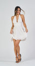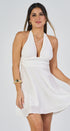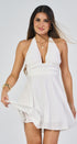 Halter mini DRESS, flared skirt, open back, pleats at the waist, ideal for a special vocation