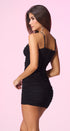 Mini DRESS color negro, con escarcha, corrugado al frente y atrás, con detalle metálico, al frente que cruza al frente, ideal para un Look moderno y casual, y una ocasión especial