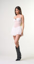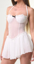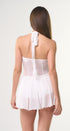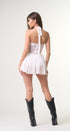 Mini redes, color blanco, tela Stretch, falda con vuelos, con Short, en la parte de abajo, para mayor comodidad, con lazo negro al frente, con tirantes, amarre en el cuello, con forro en parte del busto, espalda, abierta, ideal para un Look moderno y casual