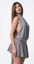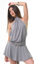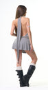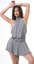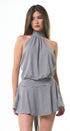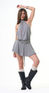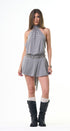 Vestido de rayitas, gris, con negro, Halter, Tela de algodón, falda, volada, espalda, abierta, amarre en el cuello, ideal para un Look moderno y casual.