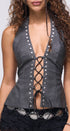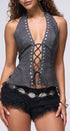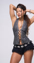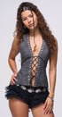 Corset color gris oscuro, con remaches plateados al frente, les Up al frente con cordón negro, espalda, totalmente abierta, con tiritas, cruzadas en la parte de atrás, corte a las caderas, ideal para un Look moderno y casual