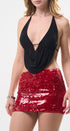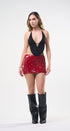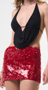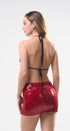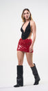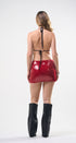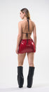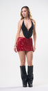 Minifalda, color rojo, con escarcha, con Short en la parte de adentro para mejor Seguridad, con cierre de zipper en la parte de atrás, ideal para un Look moderno y casual