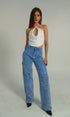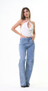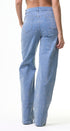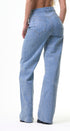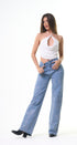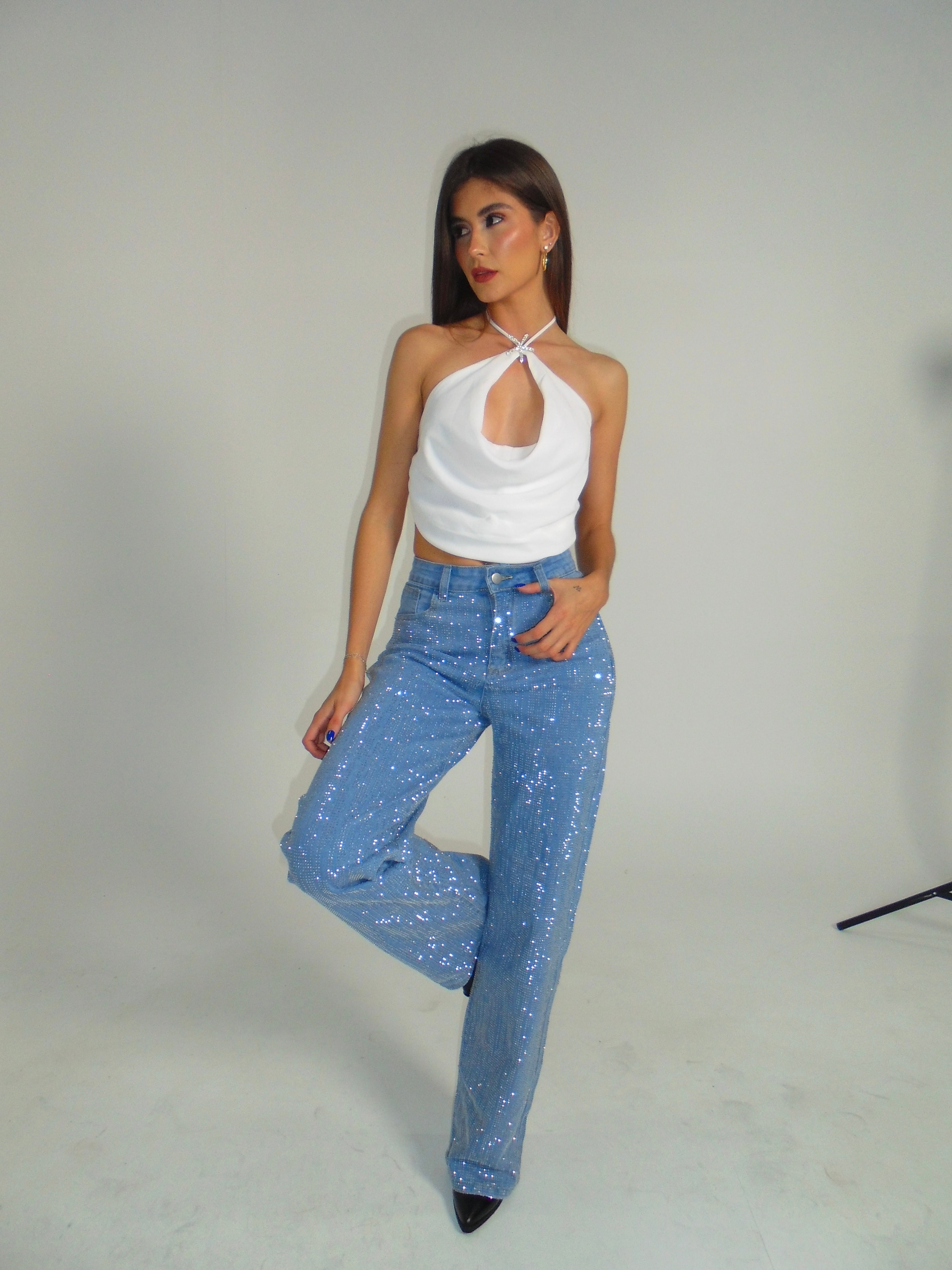 Jeans, color azul, claro con lentejuelas en la parte del frente y la parte de atrás, corte, alto, pierna, ancha, ideal para un Look moderno y casual y llamativo.