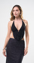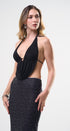 Top, color negro, espalda, totalmente abierta, amarre en el cuello, cuello de V, con corrugado en la cintura, ideal para un Look moderno y casual