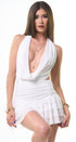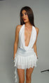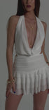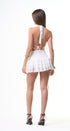 Mini tres color blanco, con cuello de Hamaca, amar en el cuello, espalda, abierta, falda, volada, Ideal para un Look moderno y casual.
