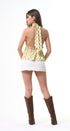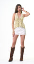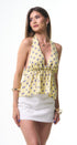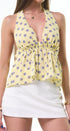 Polka doy top color amarillo, con café, ajustable en el cuello, cuello, V, espalda, abierta, corte a las caderas, vuelos de la cintura hacia las caderas.