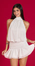 Vestido blanco, Halter, amar en el cuello espalda, totalmente abierta, falda con abuelitos y recogidas, Estela, con forro por dentro, ideal para un Look moderno, casual, y una vocación especial
