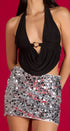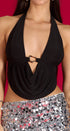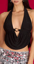 Top, color negro, amarre en el cuello, espalda, abierta, detalle metálico, dorado, al frente, ideal para un Look moderno y casual
