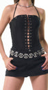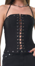 Corset Top, color negro, amarre en el cuello,, Color plateado al frente, corset al frente, córtelas, cintura, ideal para un Look moderno y casual.