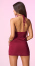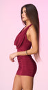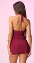 Mini tres color Burgundy, cuello de Hamaca, amarre en el cuello, espalda, abierta, tela de poliéster, Stretch, ideal para una ocasión especial.