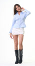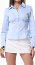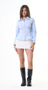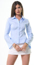 Top color celeste, con rayitas blancas, con cuello botones al frente manga larga, corte, las caderas, asentado, ideal para un Look moderno y casual.