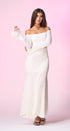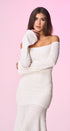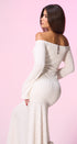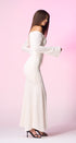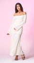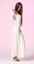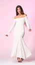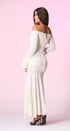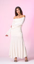 Maxi, DRESS, color, beige, Off Shoulder, manga larga, vuelos en la parte de abajo, tela de knit Estrés, ideal para un Look moderno, casual, y una ocación especia.