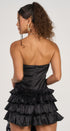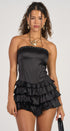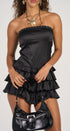 Vestido negro tela de satín, strapless, con remaches plateados en la parte de arriba, vuelos en las caderas, ideal para un Look moderno y casual