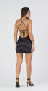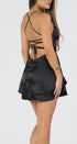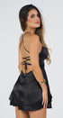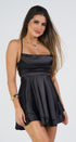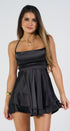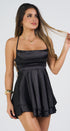 Mini DRESS de la de satín color negro espalda abierta con tirante hitos en la espalda, falda acampanada, ideal para un Look moderno y casual