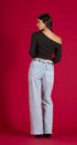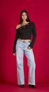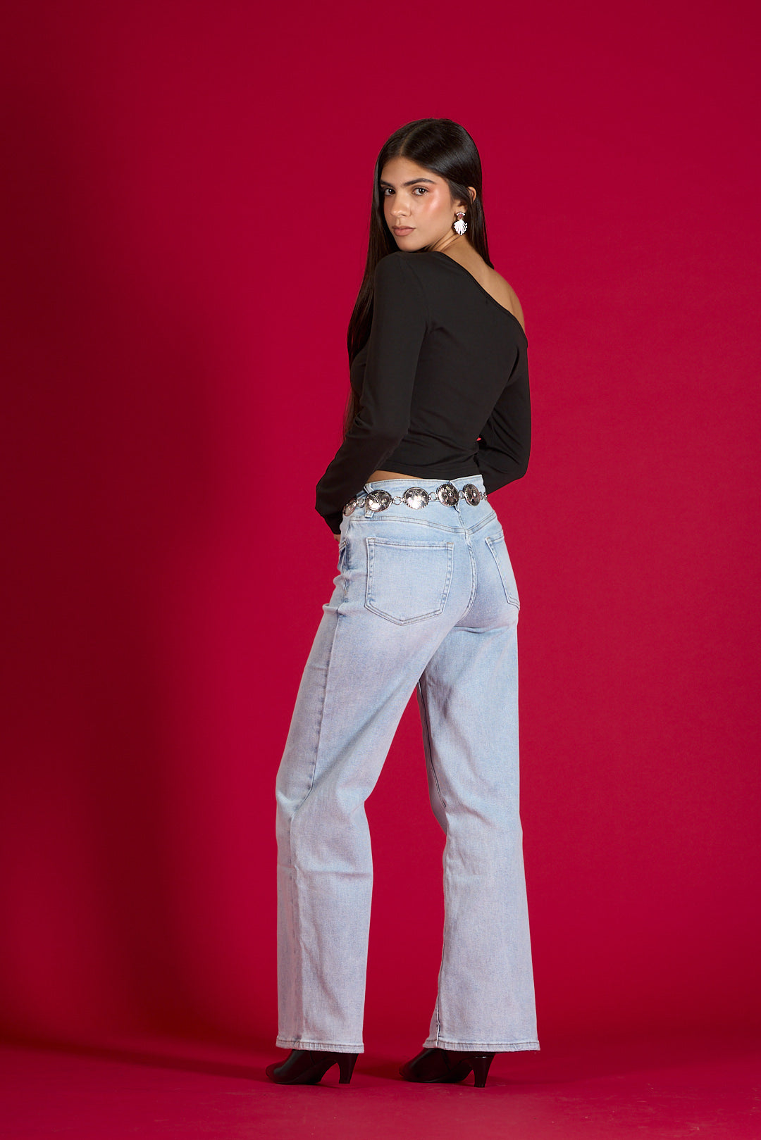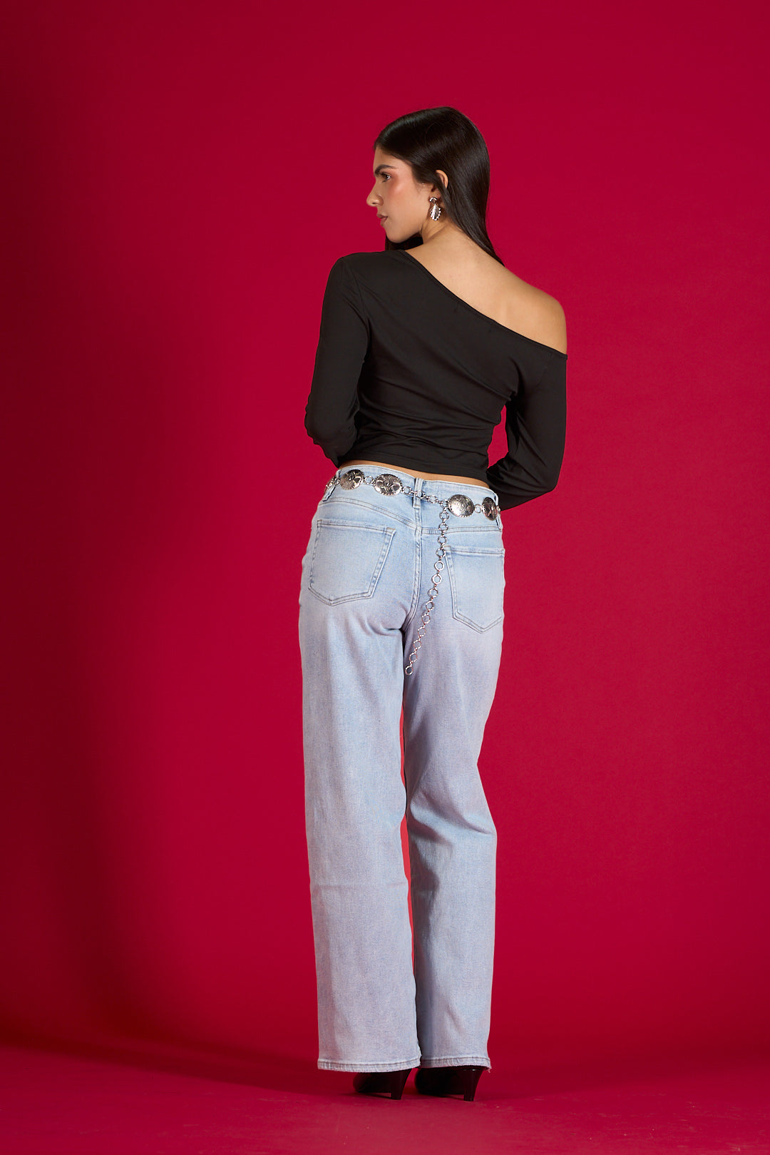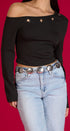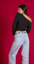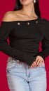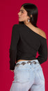 Top, color negro, asimétrico, manga larga, con remaches redondos en la parte de arriba, corte a la cintura, ideal para un Look moderno y casual