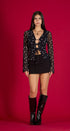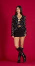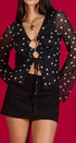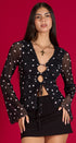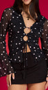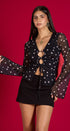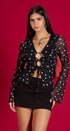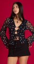 Top negra, con puntitos blancos, manga larga, campana en la manga, corte, las caderas, aberturas en la parte del frente y amarres con tiritas, de la de poliéster, mesh, ideal para un Look moderno y casual