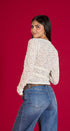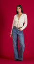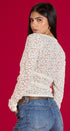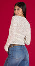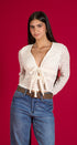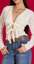 Top color Ivory, tela de encaje, manga larga, aberturas en el frente, corte a las caderas, con forro por dentro para mejor Seguridad, ideal para un Look moderno y casual