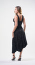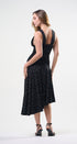 Maxi DRESS, polkadots negros, con puntitos blancos, tirantes, ancho y pliegues en la cintura, vuelos en la parte de abajo, asimétrico en la parte de abajo, tela de algodón, ideal para una vocación especial