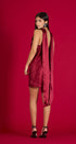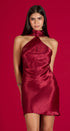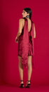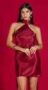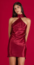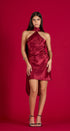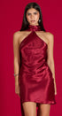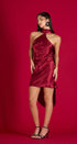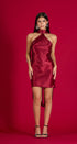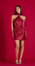 Vestido, color Burgundy, tela de satín, Halter, amarre en el cuello, espalda, totalmente abierta, corte en a pierna, ideal para una ocasión especial