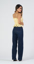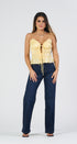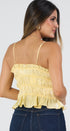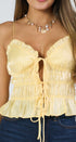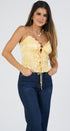 Top de tirantes color amarillo tela de satín, con el hocico debajo del pecho en la cintura y en las caderas, lacitos al frente, ideal para un Look moderno y casual