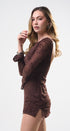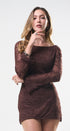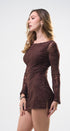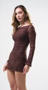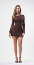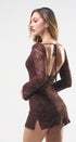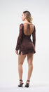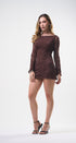Mini dresscolor café,, tela de poliéster con print de flores, en terciopelo, cuello redondo, mangas, largas, campana en las mangas, espalda, abierta, amarre en la parte de atrás de la espalda, corte acampanado en la parte de abajo, ideal para un Look moderno y casual