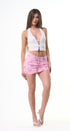 Top color blanco, con lentejuelas, cuello en V, amarre en el cuello, espalda, abierta, corte, la cintura, ideal para un Look moderno y casual.