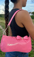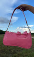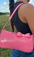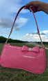 BOLSO BAGUETTE ROSA FUERTE DE JUICY COUTURE CON MONOGRAMA EN RELIEVE, DETALLE DE LAZO EN EL FRENTE Y ASA CON CADENA DORADA. 100% ORIGINAL.