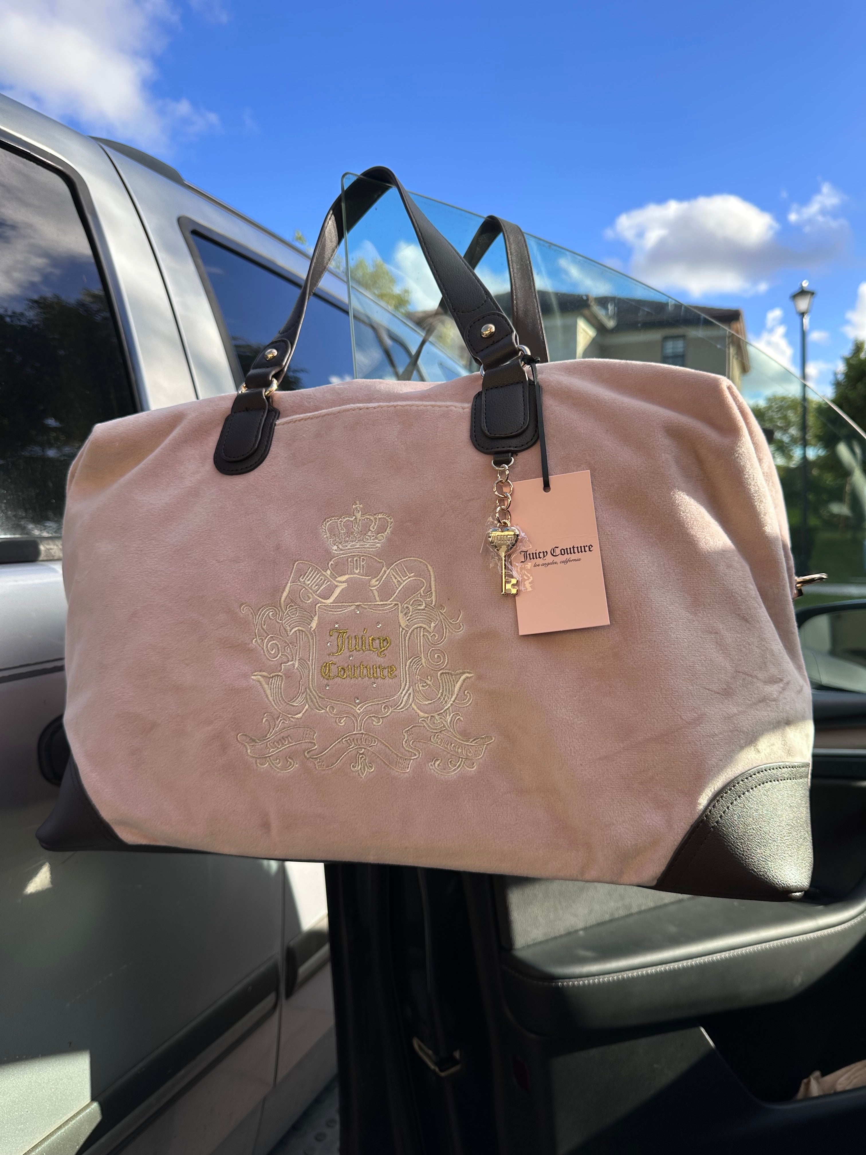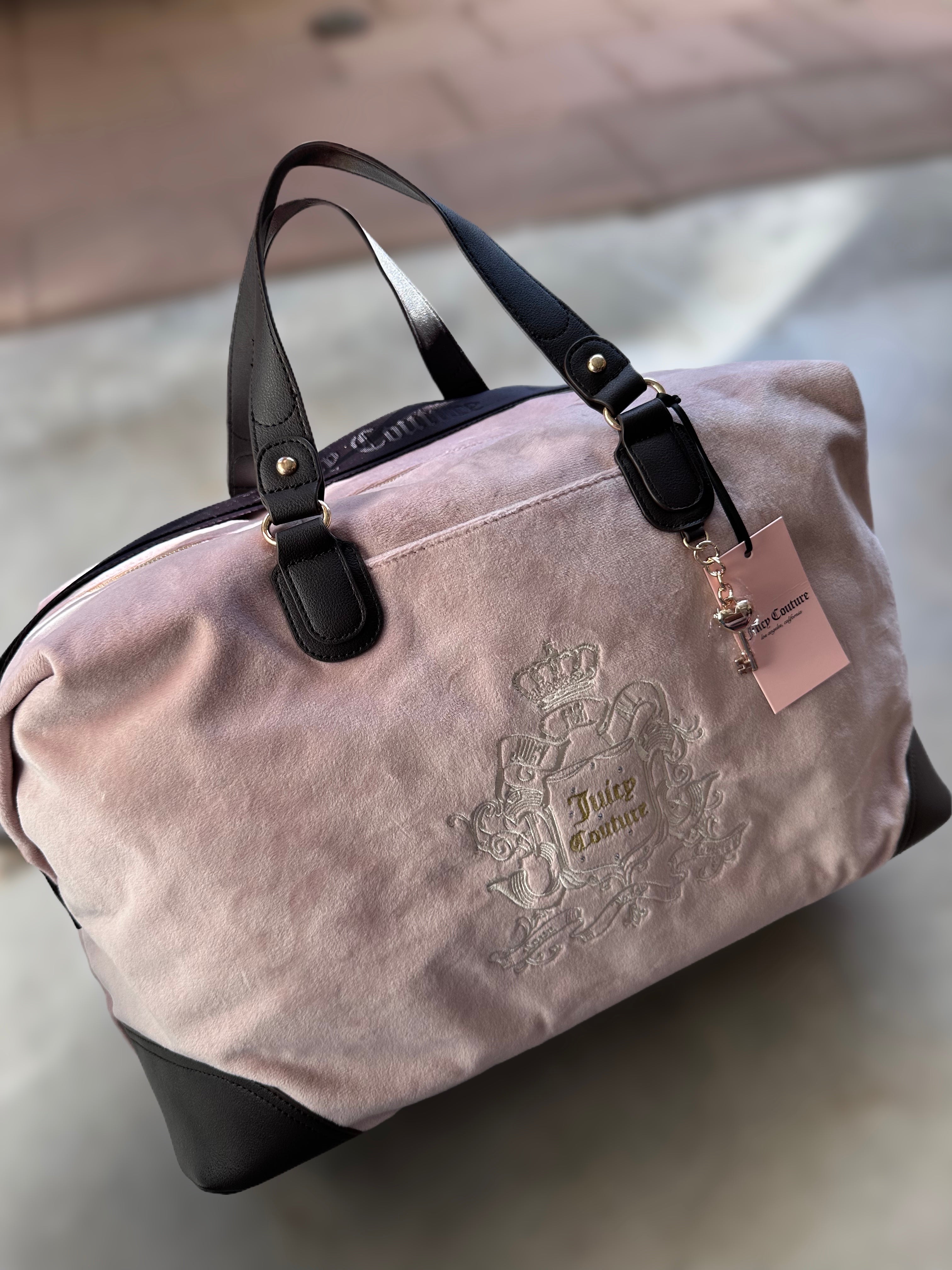 Bolso de viaje marca Juicy Couture 100% original color rosado con detalles en cuero café. Material de gamuza.