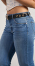 fajón negro con remaches dorados y hebilla en forma de corazón dorados