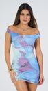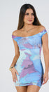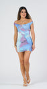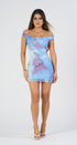 Mini DRESS of Shoulders, tela poliéster con print color celeste con abertura en la espalda, ideal para una ocasión especial