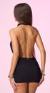 Mini DRESS color negro, con cuello de Hamaca, amarre en el cuello, detalle de perlitas en la parte de atrás, espalda, totalmente abierta, tela de poliéster, estrés, ideal para un Look moderno, casual, y una ocasión especial.
