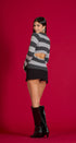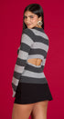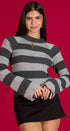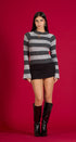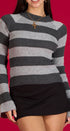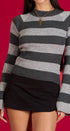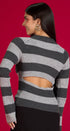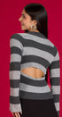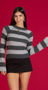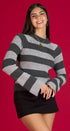 Top, suéter de rayas negro, con gris, acorde las caderas, cuello redondo, con abertura en la parte de la espalda baja, manga con campana, tela de knit estrés, ideal para los días de frío y moderno y casual