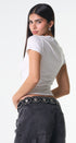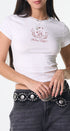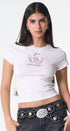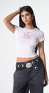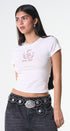 Baby tee Color blanco, tela de algodón, mangas cortas, corte a las caderas, con print Feeling, Lucky, ideal para un Look urbano