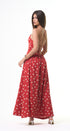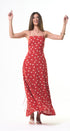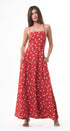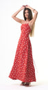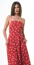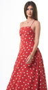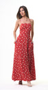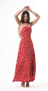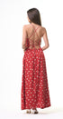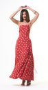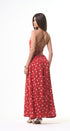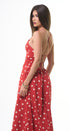 Polka Dots maxi, DRESS, rojo, con blanco, cuello, V, amarre en el cuello, espalda, abierta, falda, larga, con Bolsas a los lados, ideal para una ocasión especial.