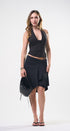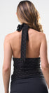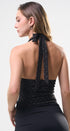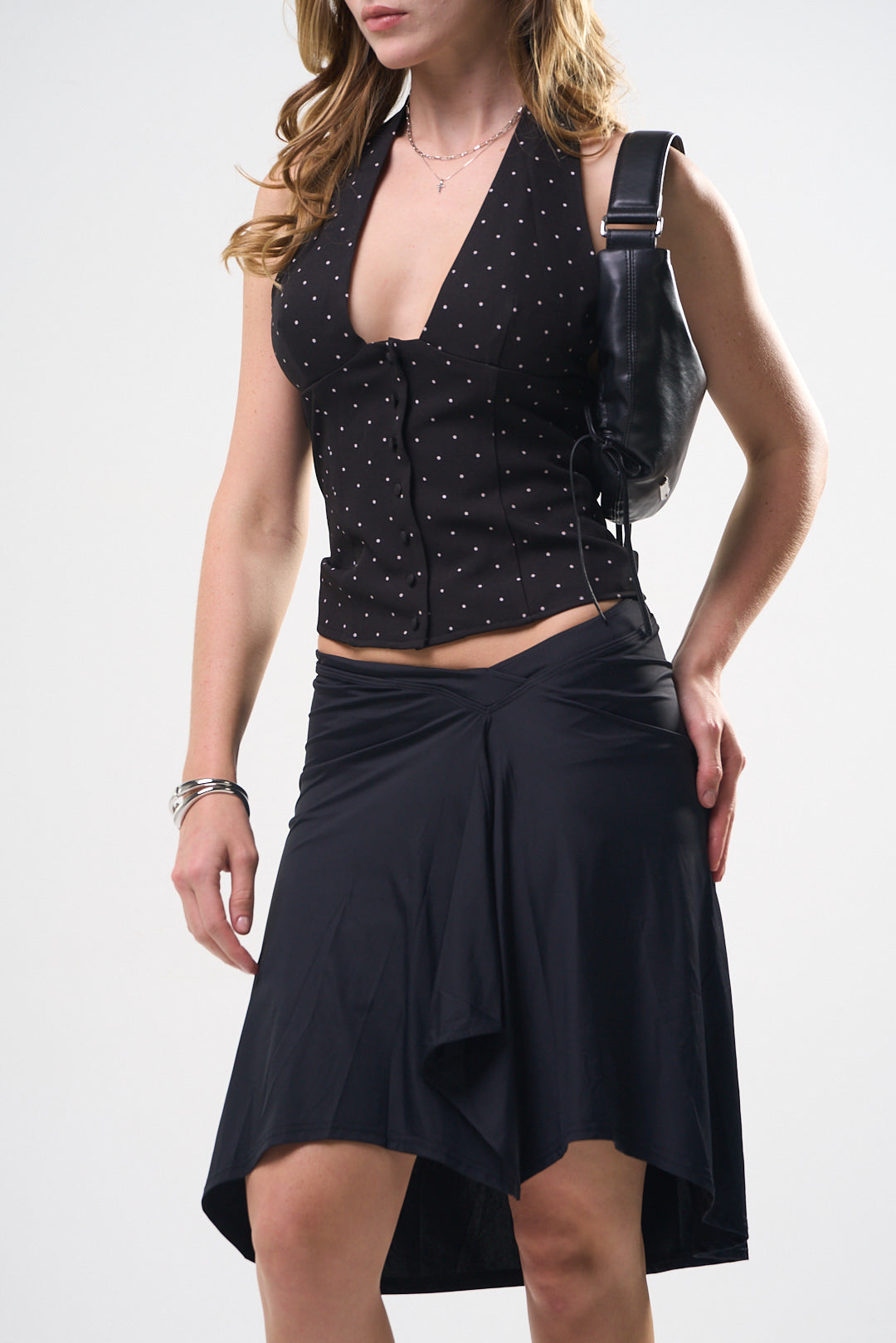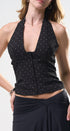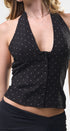 Top, color negro, con puntitos blancos, botones al frente, cuello de V, espalda, abierta, amarre en el cuello, corte a las caderas, tela de algodón, ideal para un Look moderno y casual