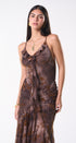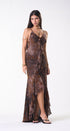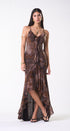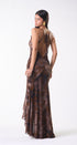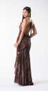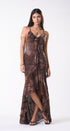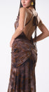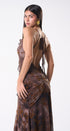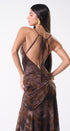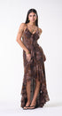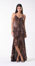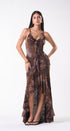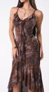 Vestido, color moca, con print café, abertura con vuelos al frente, tirantes, ajustables, espalda, abierta, curitas, ajustables, atrás en la espalda, ideal para una educación especial