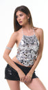 Crop, Top de lentejuelas, color plateado, amarre en el cuello, espalda, abierta, corte a las caderas en pico, ideal para un Look moderno, casual y llamativo.