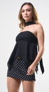 Minifalda, color negro, polkadots con puntitos blancos, con Short en la parte de abajo para una mejor Seguridad, ideal para un Look moderno y casual