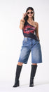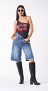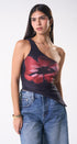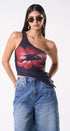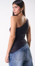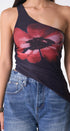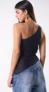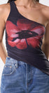Top negro, asimétrico, comprende rosa al frente, tela de poliéster, ideal para un Look moderno y casual