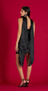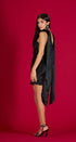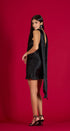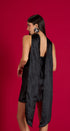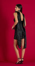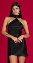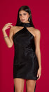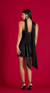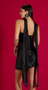 Vestido, color negro, tela de satín, Halter, amarre en el cuello, espalda, totalmente abierta, corte en a a media pierna, ideal para una vocación especial